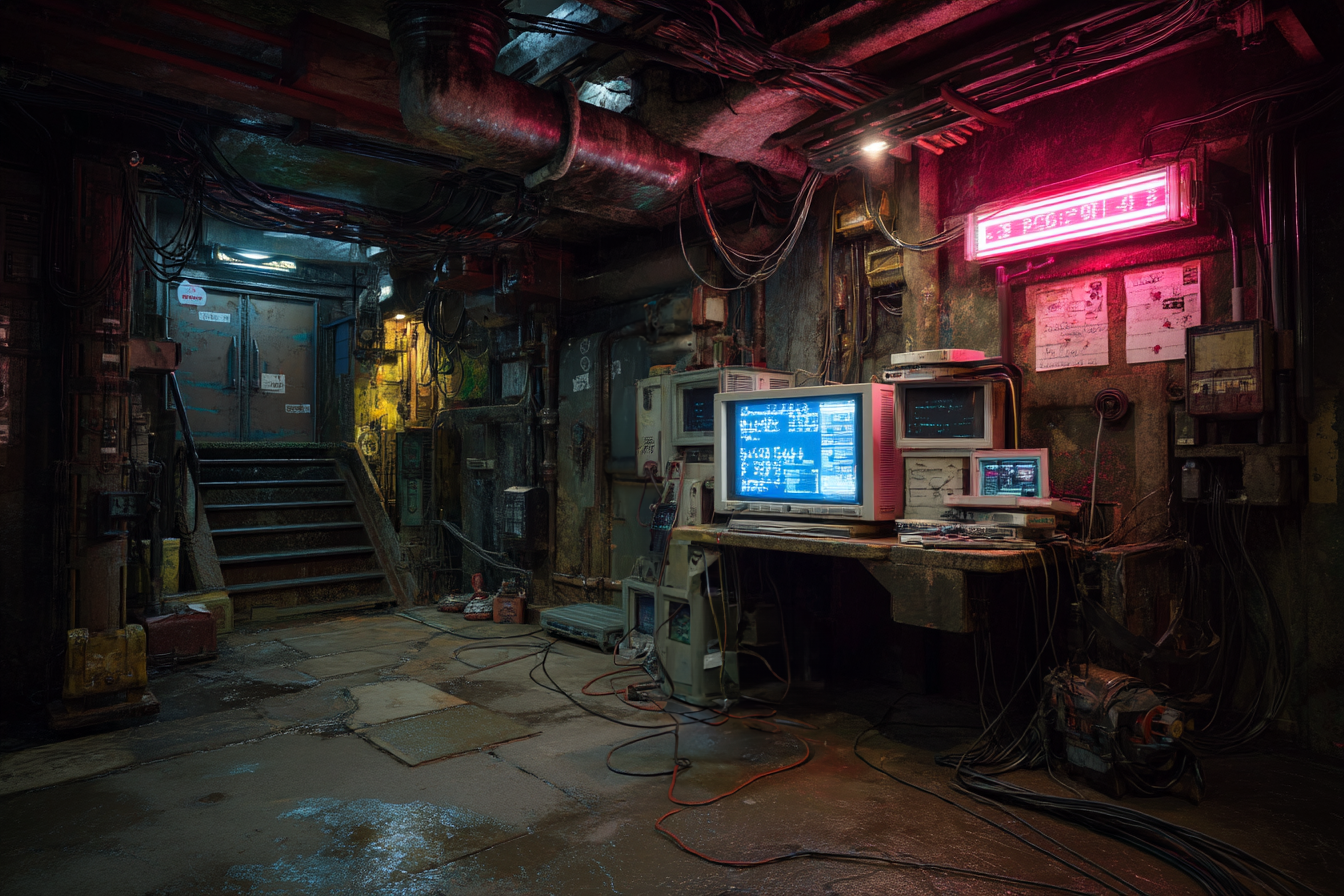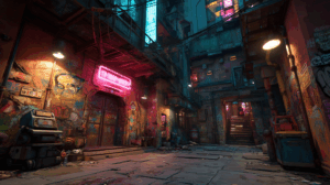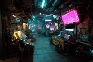 ネオン街や隠れ家など、サイバーパンクの世界観を表現したディストピアな背景素材です。