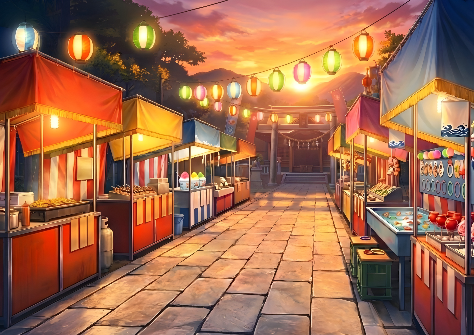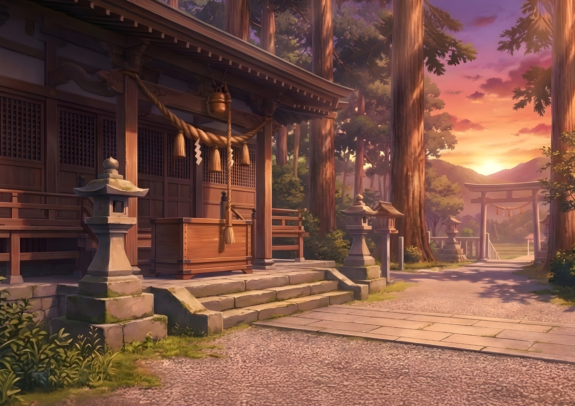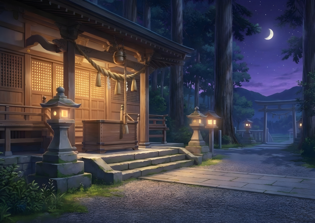 昼・夕・夜の情景をまとめた神社の背景イラストです。