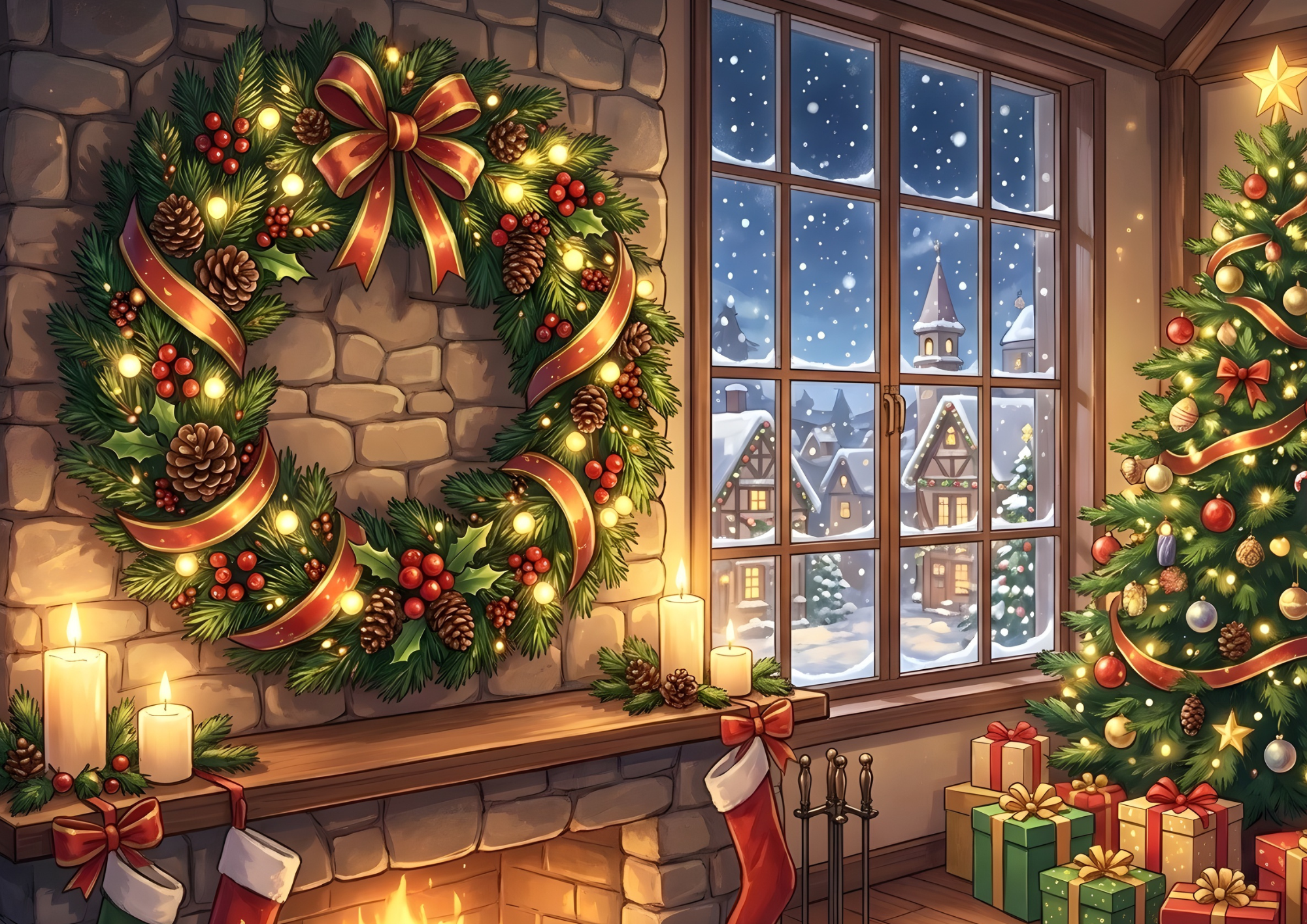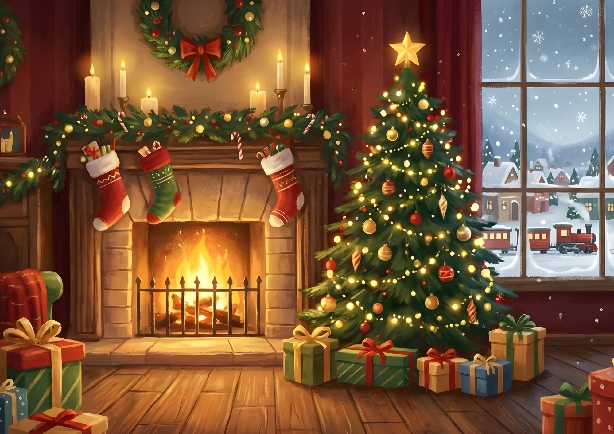 クリスマスの飾りつけがされた部屋やリビングルームの背景イラストです。